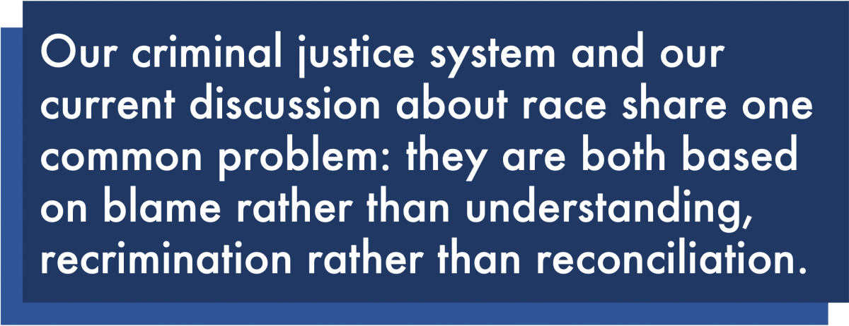 Our criminal justice system and our current discussion about race share one common problem: they are both based on blame rather than understanding, recrimination rather than reconciliation. While the prosecution in the McMichaels and Bryan case have to present specific evidence to essentially show that the defendants intended to capture and kill Ahmaud Arbery, there is no room to understand how long-standing racial stereotypes, implicit bias, Georgia’s citizen arrest laws, and gun ownership may have all contributed to a fateful confrontation on a February afternoon. Jurors will only judge whether the defendants committed felony murder or aggravated assault and whether they were justified in making a citizen’s arrest and acted in self-defense.